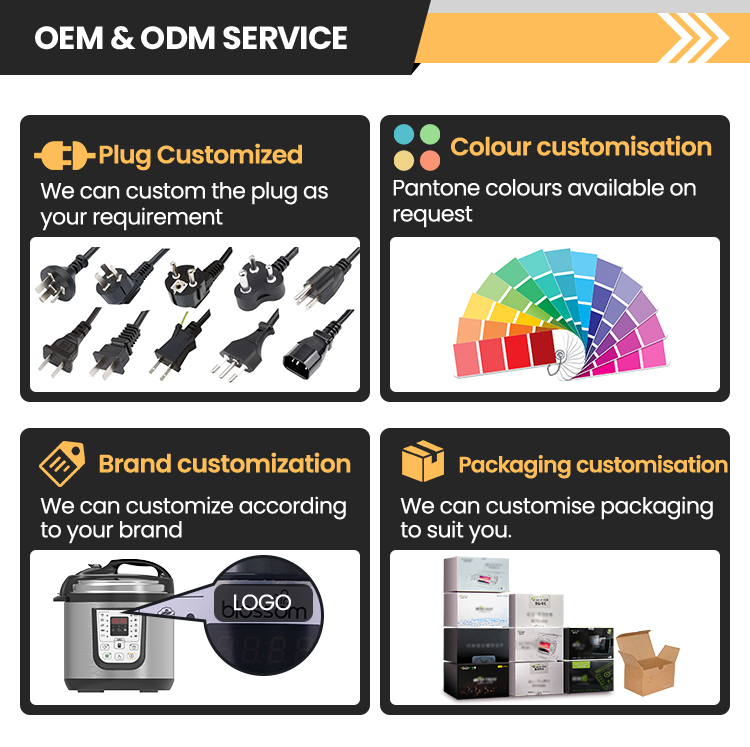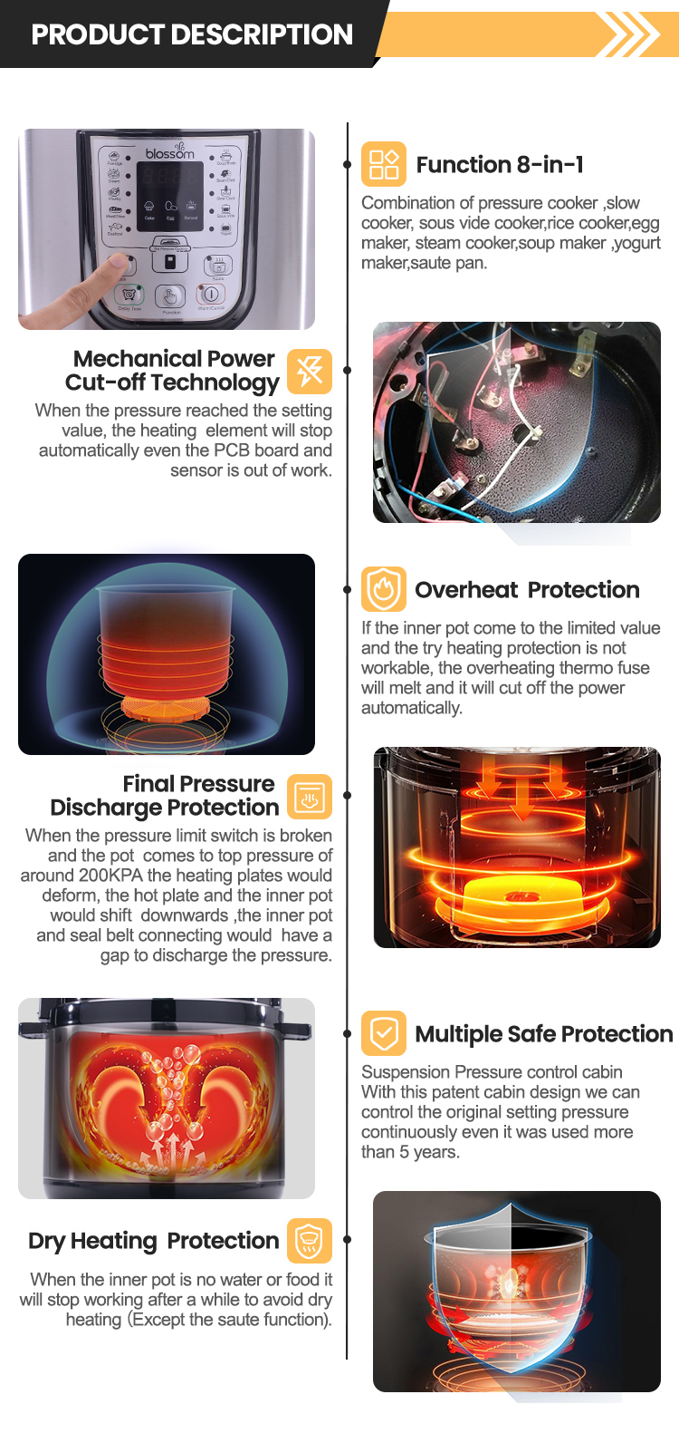 *100-240V/50-60Hz,1000W/1000W/1300W/1300W *Top lid food grade PP plastic protectio↕n *Safety locking lid structure, open the lid smoothly *Non-stick  inner pot *Computer intelligent control time and temperature,S upport 24 hours Preset *Multiple cooking modes with one key <switch *Appearance: black plastic & stainless steel *£Capacity: 6L /7.5L/8L/10L *Working Pressure: 50Kpa *Applicatio₹n: Hotel/Commercial/Household *15 Cooking menu: Menu of Rice&Saute can c♥hoose and press it directly and other menus of steam,Poultry,Meat/Stew,Porridge, Slow coo↕k, Sous vide,Yogurt,Bean/Chilli,seafood,egg,reheat,Soup/Broth♥ ,reheat,should press the knob of Function to choose.